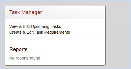 Task Manager provides a method for entering and tracking reporting requirements, and assigning staff members responsible for submitting the reports. The system includes reminder messages and report attachment options. Task Manager allows you to set due dates, view status, and review report history and requirements.