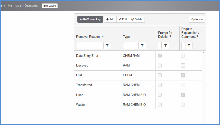 InventoryRAM Inventory Removal Reason Removal Reasons The Removal Reason list is maintained from the [More] menu button on the Inventory screen. This opens the Removal Reasons listing screen Use Add, Edit, Delete to make entries/edits as needed.