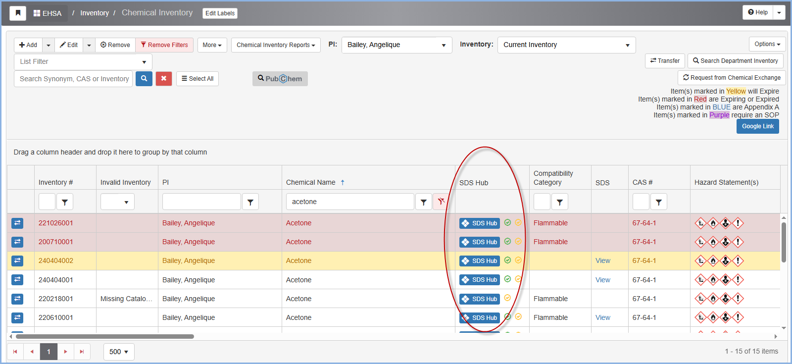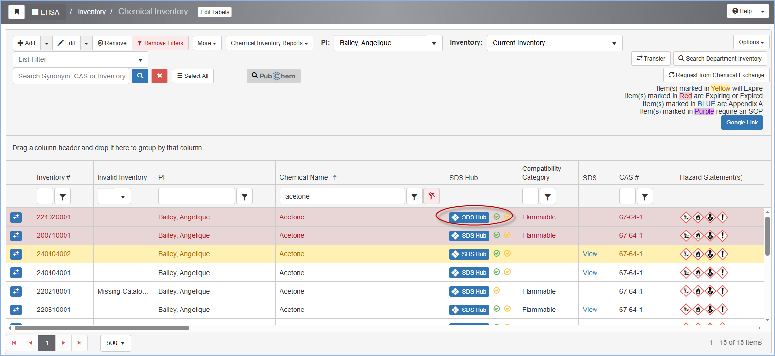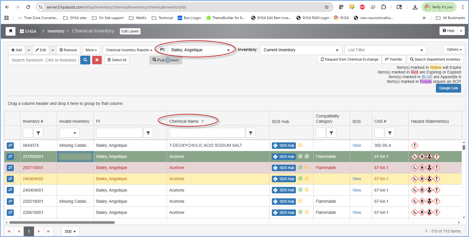 An admin user can select a PI's Chemical Inventory. Proceed to filter out a chemical under Chemical Name.