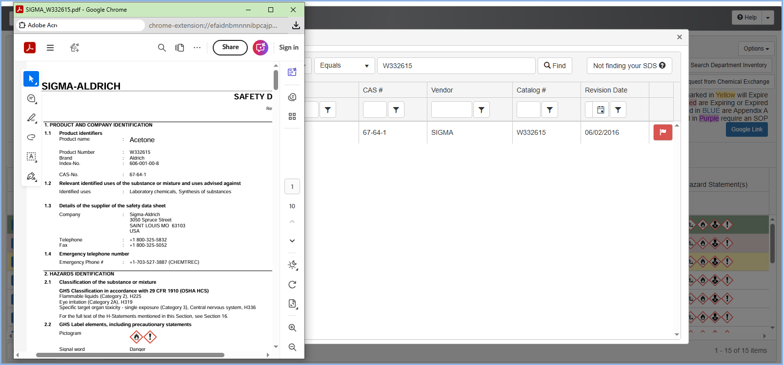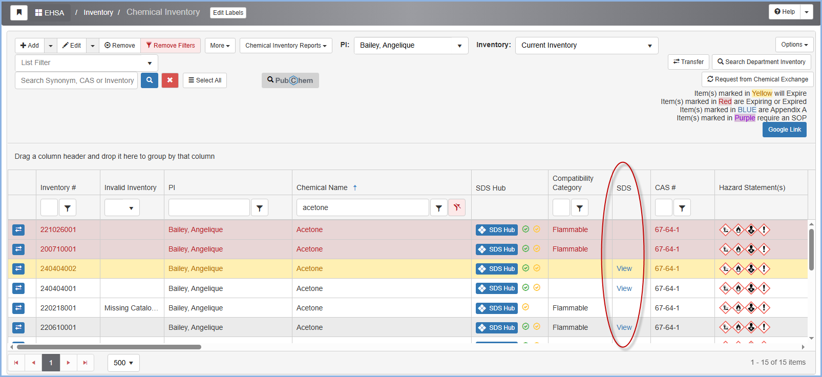 The SDS column allows clients to view their own uploaded SDSs, which are linked to their chemical inventory - such as Acetone, as shown in the example below.