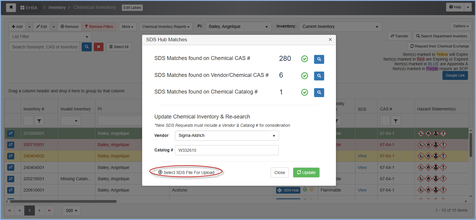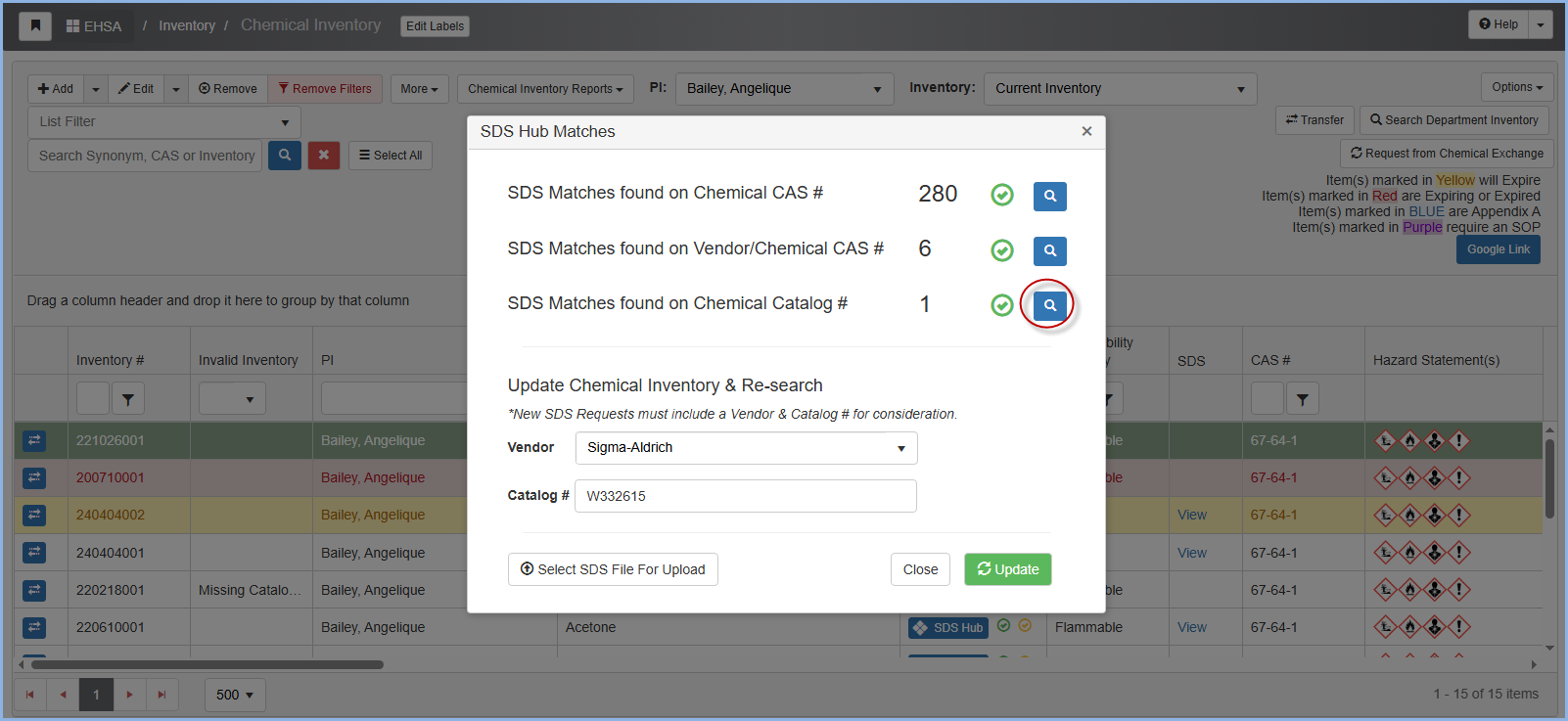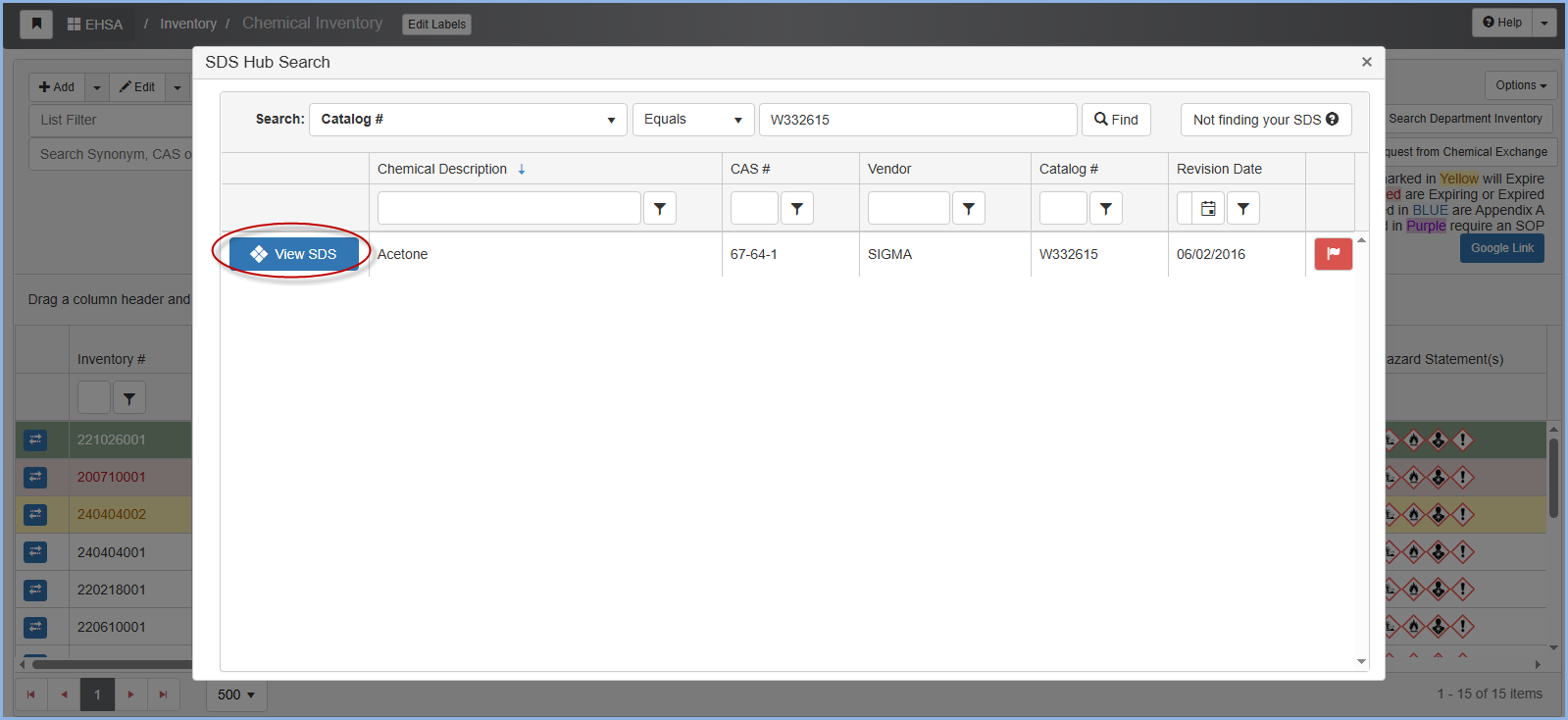 Click the blue SDS Hub button in the row associated with the chemical to view the SDS Hub matches.