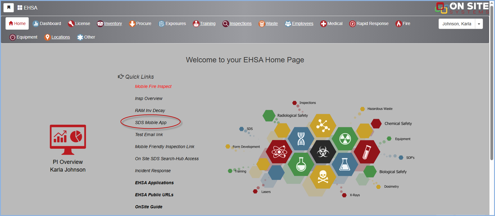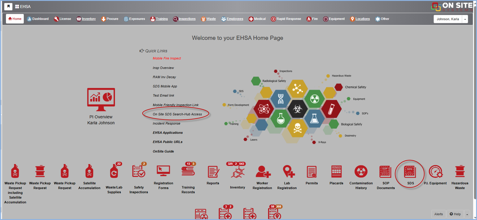 To access the SDS Hub, click on On Site SDS Search-Hub-Access under Quick Links, or by the SDS Hub icon in the lower portion of your screen.