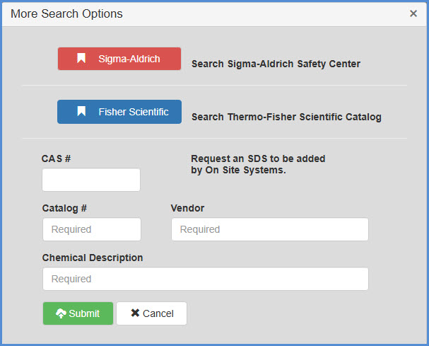 Fill out the desired SDS’ information. *New SDS Requests must include a Vendor & Catalog # for consideration.